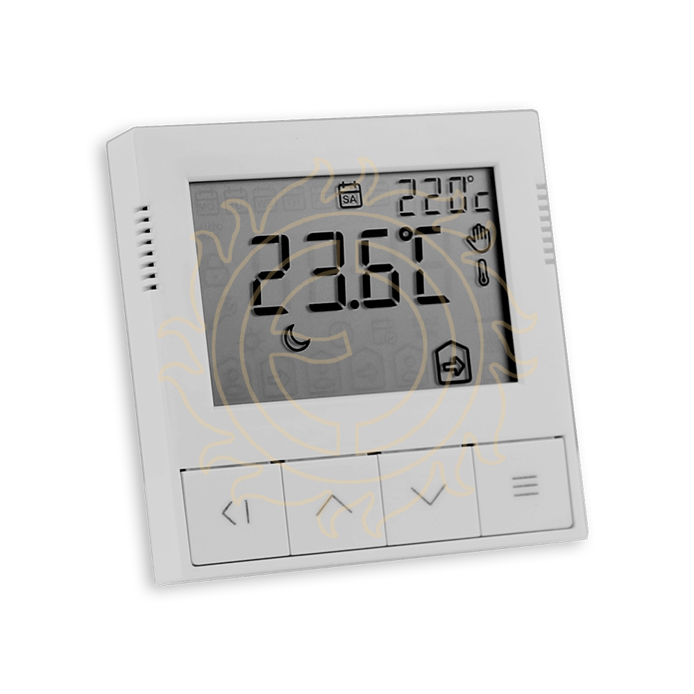 LCD display 2,8" (bez podsvícení), uživatelsky volitelné snímaní teplot - jen prostoru, podlahy, nebo obou hodnot. Týdenní program - až 6 teplotních změn denně mezi přednastavenou komfortní a útlumovou teplotou, režim ručního ovládání, režim protimrazové ochrany (5 °C). Možnost softwarového vypnutí termostat, volitelná funkce "Detekce otevřeného okna", možnost uzamčení ovládání (tzv. dětský zámek).