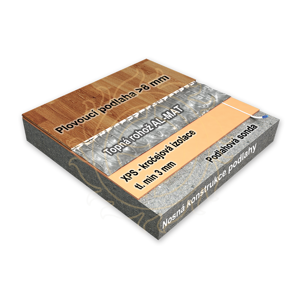 POZOR - v kombinaci s rohožemi AL MAT se musí použít kročejová izolace z extrudovaného polystyrenu o min. tloušťce 3 mm (Starlon, Depron apod.).